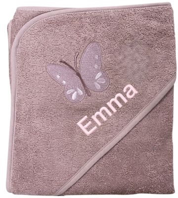 Det fine design i støvet rosa med en smuk sommerfugl gør badeslaget både elegant og hyggeligt. Med et broderet navn bliver det en personlig del af hverdagen og et minde fra barnets første tid.