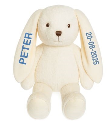 Vi broderer fornavn i det ene øre og dato eller efternavn i det andet efternavn. Du har mulighed for at vælge både trådfarve og skrifttype, så bamsen bliver helt personlig.