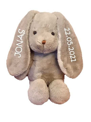 Vi broderer et fornavn i det ene øre og en dato i det andet øre.
